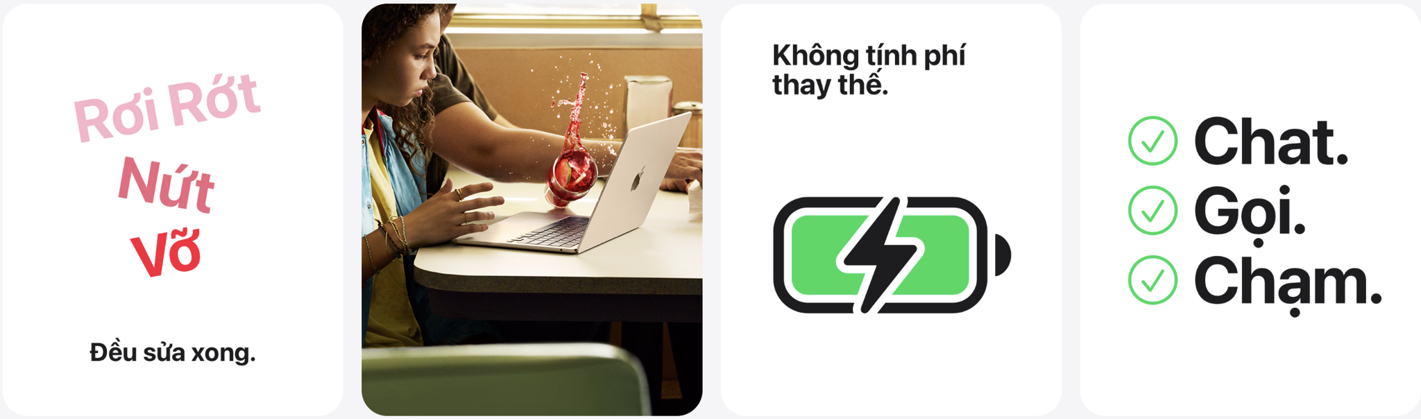 AppleCare cung cấp dịch vụ hỗ trợ và bảo dưỡng một cửa cho tất cả sản phẩm Apple của bạn – từ các chuyên gia am hiểu sản phẩm nhất. Sửa chữa nhanh chóng, dễ dàng cho các sự cố như rơi rớt và làm đổ chất lỏng. Dịch vụ thay pin khi dung lượng pin còn lại ít hơn 80%. Và dịch vụ chăm sóc ưu tiên qua chat, điện thoại hoặc chỉ một cú chạm.